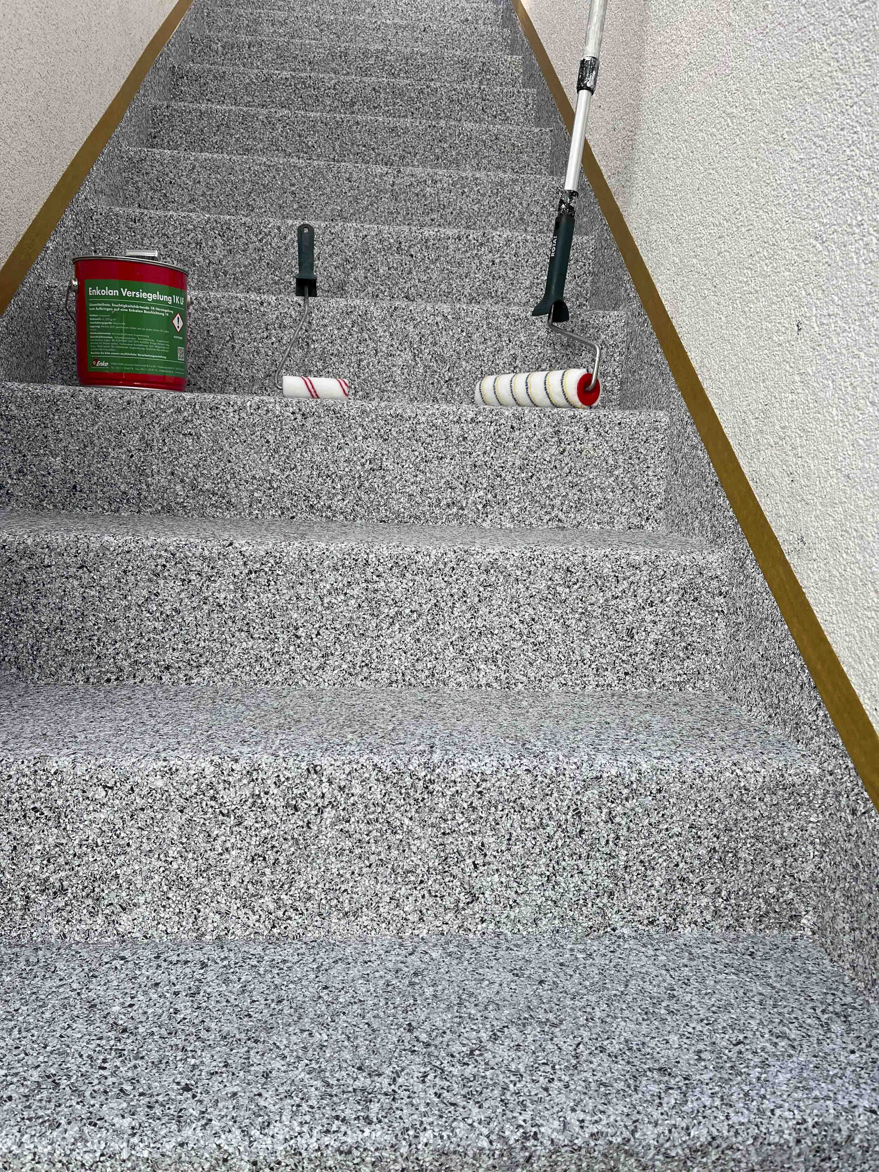 Die Abdichtung erfolgte mit Enkolan in Kombination mit Enke Polyflexvlies. Anschließend wurde Enkolan als Beschichtung mit Quarzsand in der Körnung 0,2 bis 0,6 mm eingestellt, um eine trittsichere, belastbare Oberfläche zu schaffen. Für die dekorative Optik wurde Enketop Chips Muster 06 vollflächig eingestreut. Den Abschluss bildete die transparente Enkolan Versiegelung als dauerhafter Schutz.
