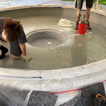 Darauf folgte eine dekorative und schützende Enkolan Beschichtung 1K LF, die vollflächig mit Enketop Chips abgestreut wurde. Diese sorgen für eine ansprechende Optik und verbessern gleichzeitig die mechanische Belastbarkeit. Den Abschluss bildete die Enkolan Versiegelung 1K LF, die das System dauerhaft schützt und das Erscheinungsbild abrundet.