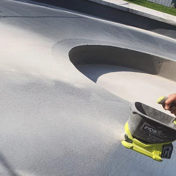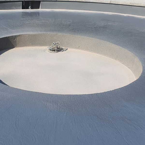 Besonders vorteilhaft: Die geschmeidige Struktur des Vlieses ermöglichte eine exakte Anpassung an die runde Form des Brunnens. Für zusätzliche Stabilität und ein gleichmäßiges Oberflächenbild wurde die Fläche vollständig mit feuergetrocknetem Quarzsand abgestreut. Zum Abschluss trugen die Verarbeiter die Enkolan Versiegelung in RAL 7035 lichtgrau auf – gleichmäßig, streifenfrei und mit einem dauerhaft ansprechenden Ergebnis.