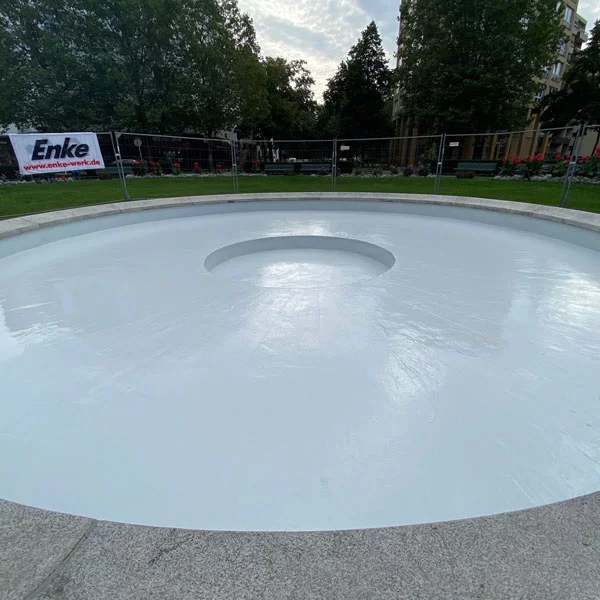 Im Rahmen der Sanierung des kreisrunden Brunnens am Prager Platz wurde zunächst die gesamte Altbeschichtung entfernt. Dafür wurde das Becken gefräst und gründlich gereinigt, um eine gleichmäßige Haftfläche zu schaffen. Anschließend begann der Aufbau des Enkolan-Systems – ohne zusätzliche Grundierung, denn die 1-komponentige Enkolan Abdichtung 1K LF kann direkt auf den vorbereiteten Untergrund aufgetragen werden.