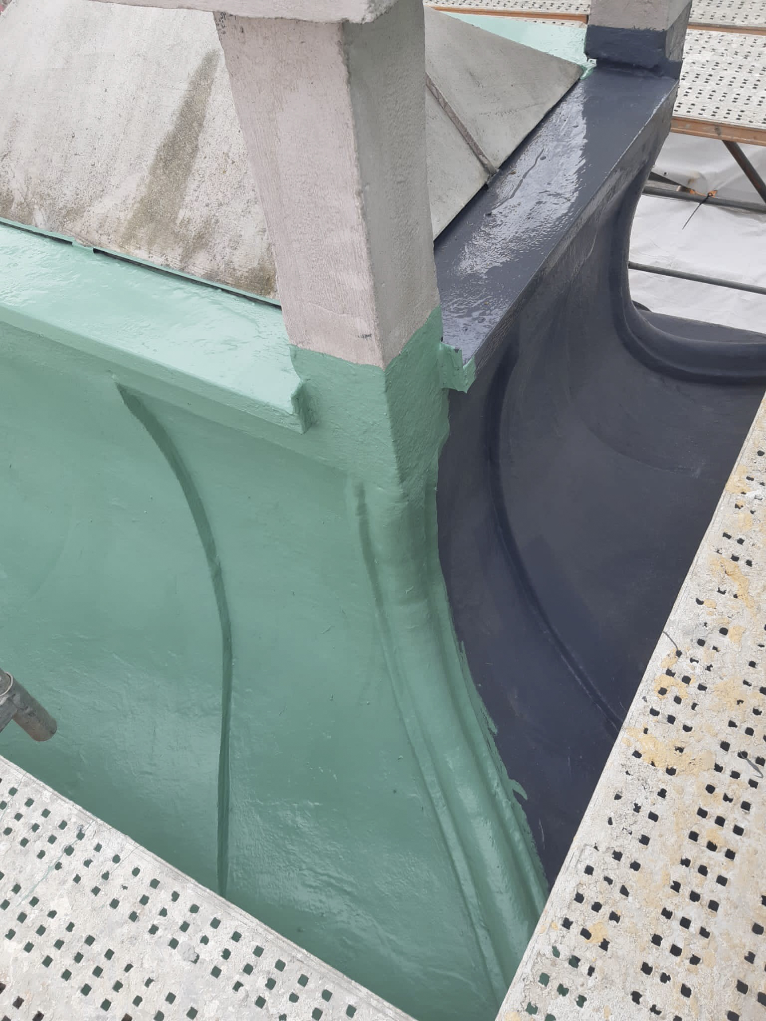 Im nächsten Schritt folgte Enke Multi Protect in der Standardfarbe Patina. Für die besondere Optik wurde eine spezielle Wischtechnik eingesetzt, bei der Acrylate beigemischt wurden. Dadurch entstand ein Finish, das einem gealterten Kupferdach sehr nahekommt. Das Ergebnis verbindet Schutz und Gestaltung in einem Systemaufbau und zeigt, wie aus einer Sanierungsaufgabe eine überzeugende Designlösung werden kann.